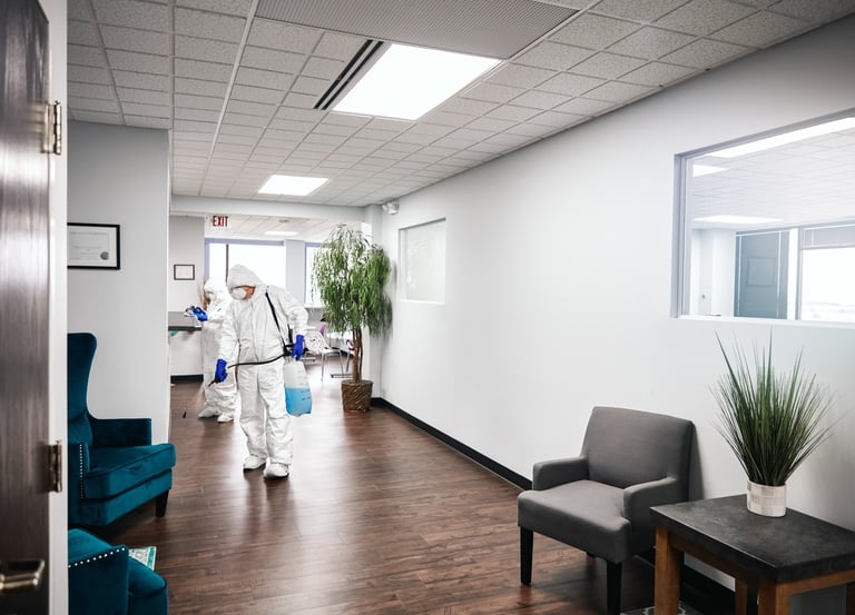 Using EPA-approved disinfectants or cleaning agents applied via sprayers, foggers, or electrostatic sprayers to sanitize surfaces and spaces.